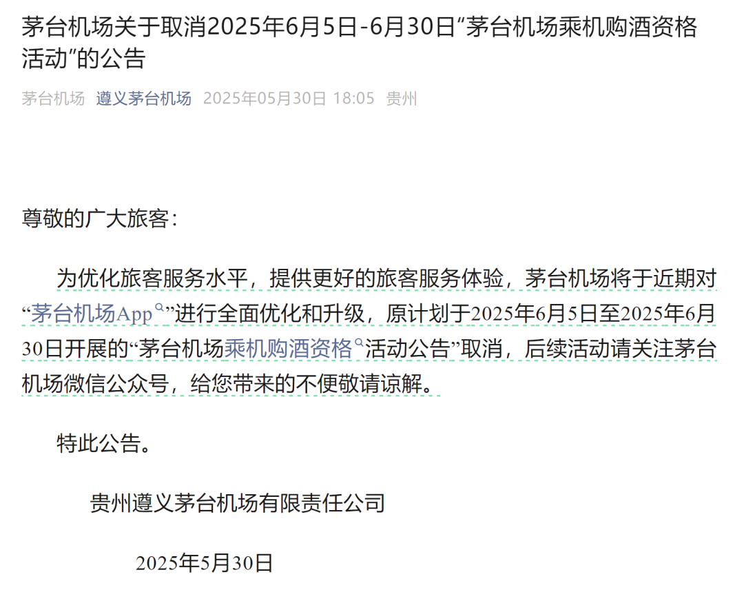 然而,5月30日18时许,即活动公告发布第二天,遵义茅台机场官微就宣布,原计划于2025年6月5日至2025年6月30日开展的“茅台机场乘机购酒资格活动公告”取消。而取消原因为“茅台机场App优化升级”。