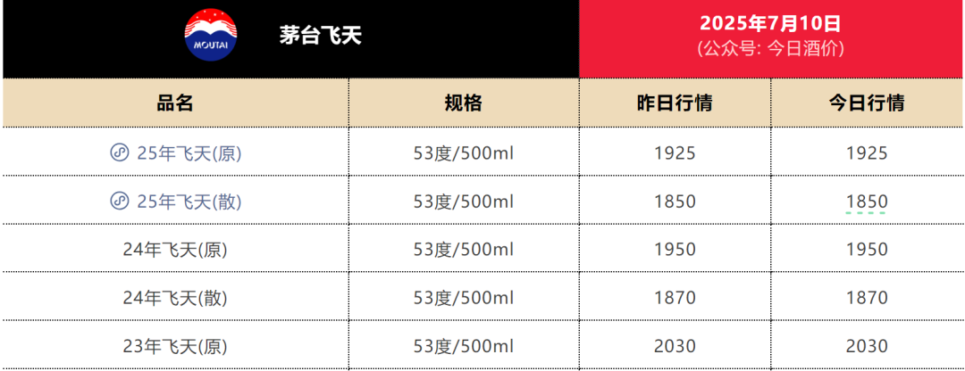 今日酒价披露的批发参考价显示,7月10日,25年飞天茅台原箱报1925元/瓶;25年飞天茅台散瓶报1850元/瓶。